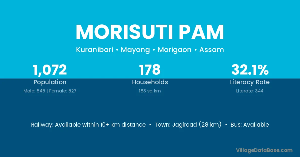 Jagiroad (28 km) is the nearest town to Morisuti Pam village for major economic activities and is located approximately 28 km away.