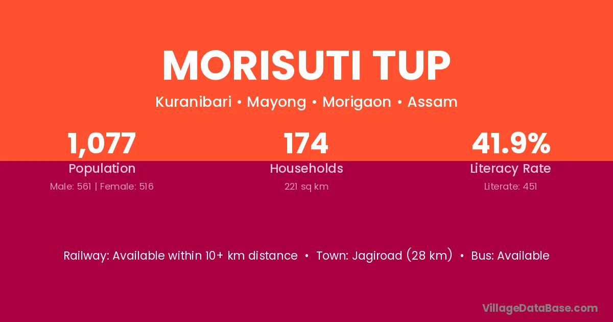 Jagiroad (28 km) is the nearest town to Morisuti Tup village for major economic activities and is located approximately 28 km away.