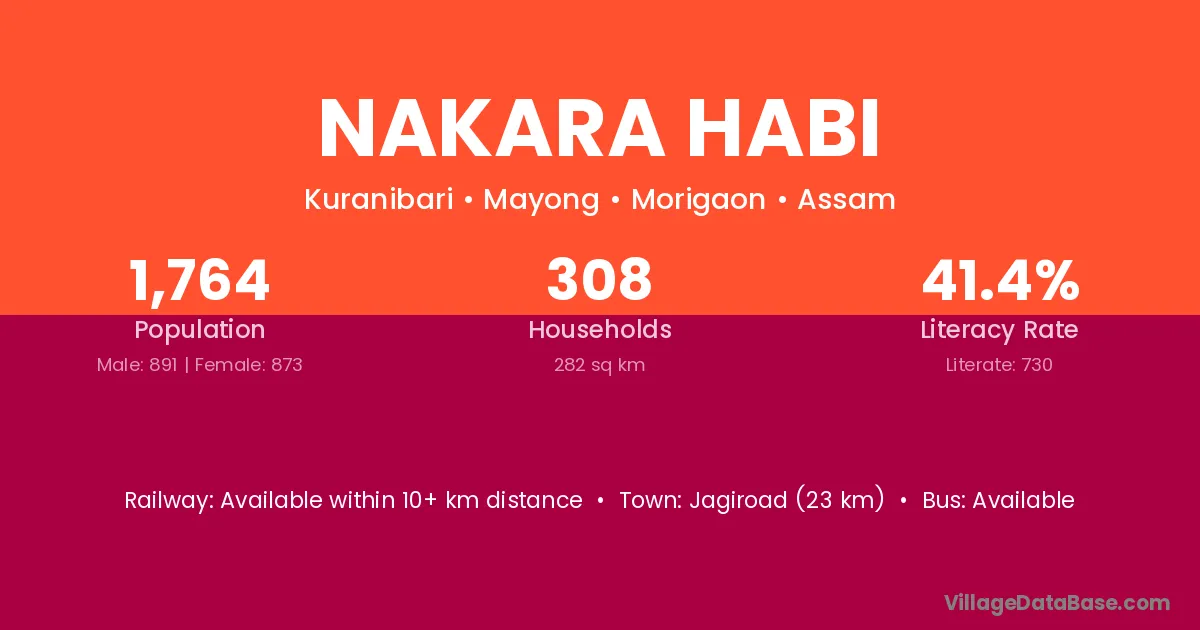 Jagiroad (23 km) is the nearest town to Nakara Habi village for major economic activities and is located approximately 23 km away.
