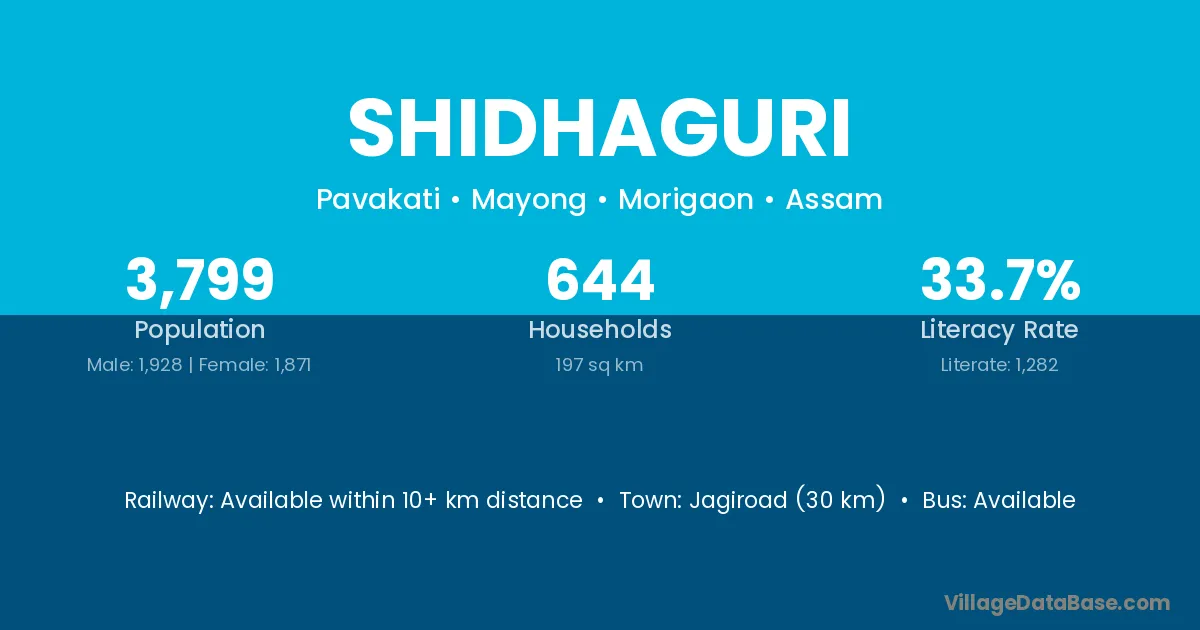 Jagiroad (30 km) is the nearest town to Shidhaguri village for major economic activities and is located approximately 30 km away.