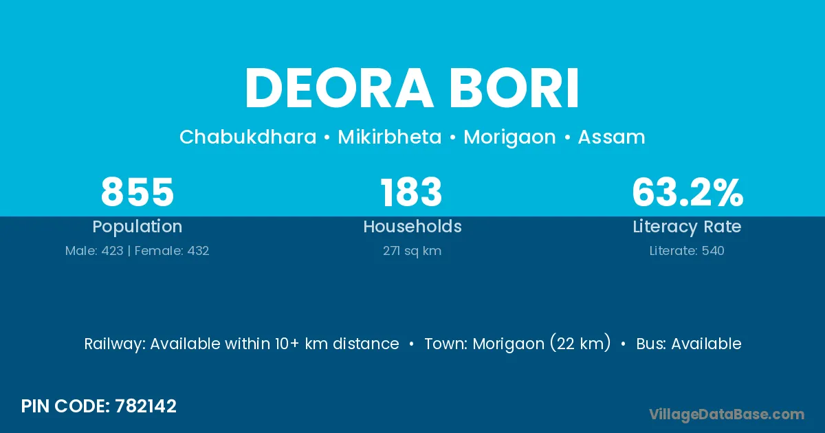 Morigaon (22 km) is the nearest town to Deora Bori village for major economic activities and is located approximately 22 km away.
