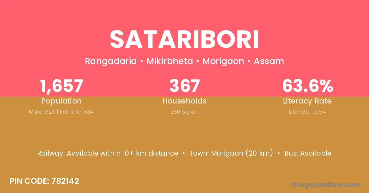 Morigaon (20 km) is the nearest town to Sataribori village for major economic activities and is located approximately 20 km away.