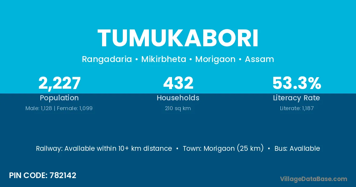 Morigaon (25 km) is the nearest town to Tumukabori village for major economic activities and is located approximately 25 km away.