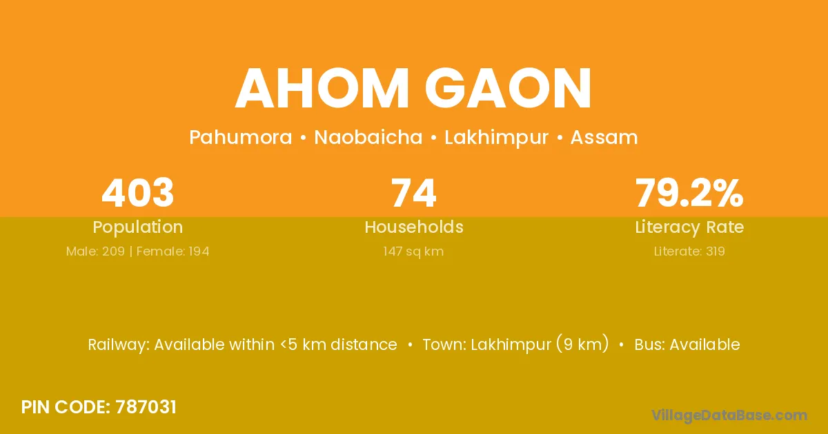 Ahom Gaon village has a total population of 2,324 people, of which 1,162 are males and 1,162 are females.