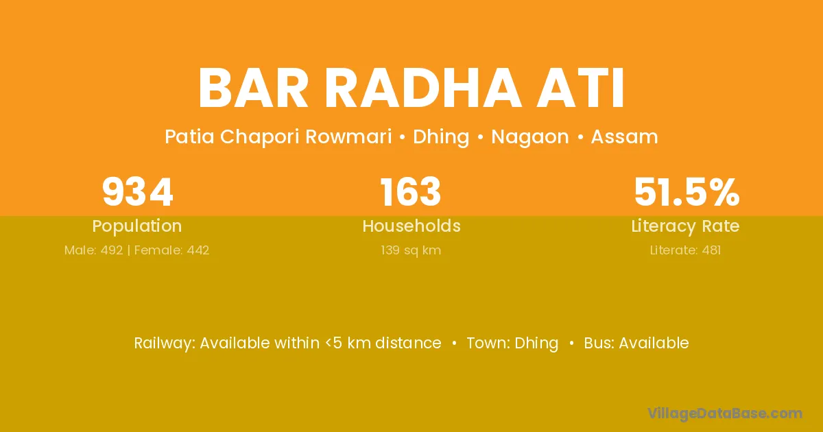 Dhing is the nearest town to Bar Radha Ati village for major economic activities