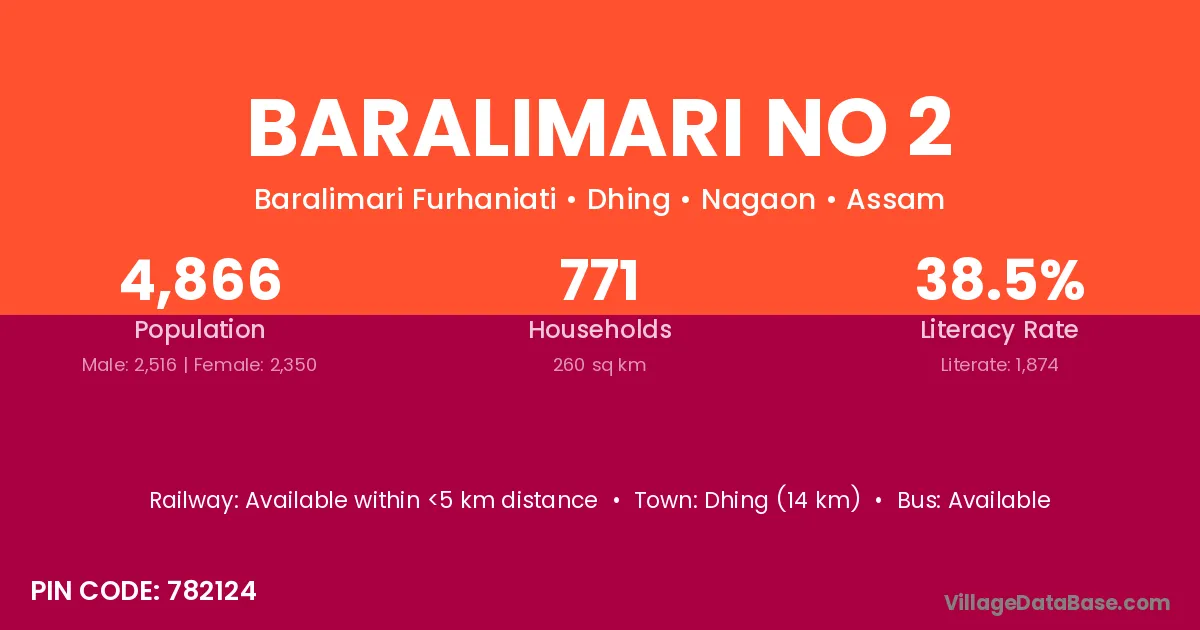 Dhing (14 km) is the nearest town to Baralimari No 2 village for major economic activities and is located approximately 14 km away.