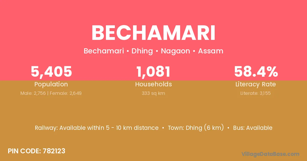 Dhing (6 km) is the nearest town to Bechamari village for major economic activities and is located approximately 6 km away.
