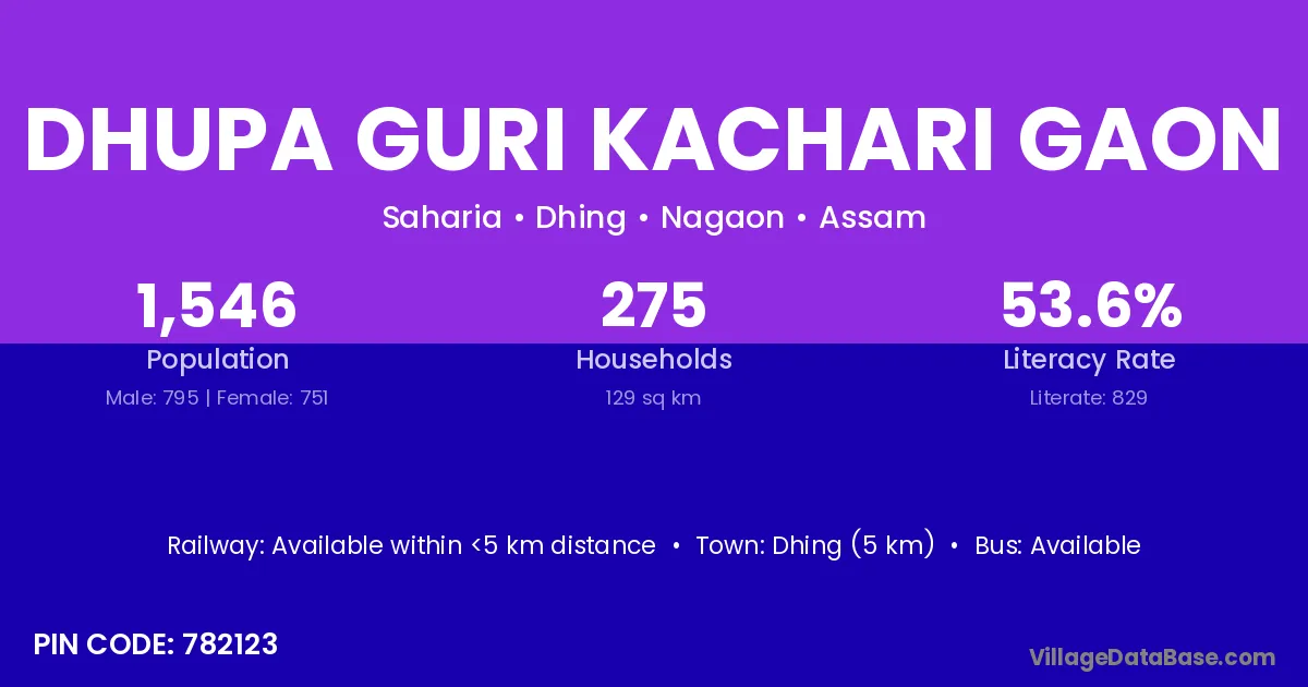 Dhing (5 km) is the nearest town to Dhupa Guri Kachari Gaon village for major economic activities and is located approximately 5 km away.