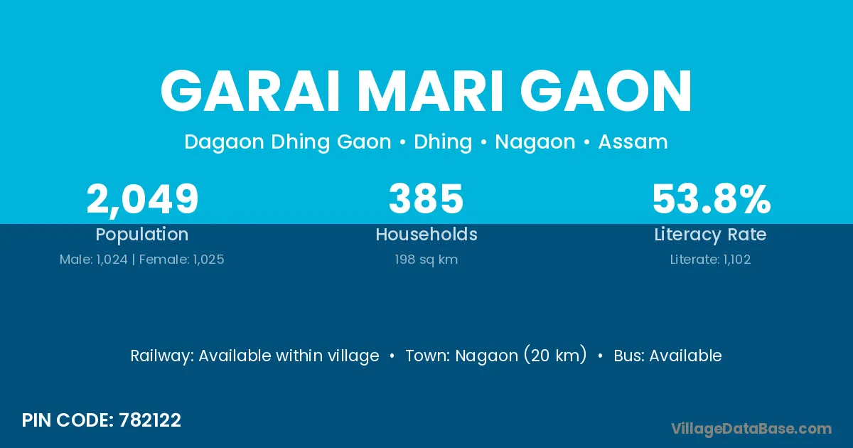 Nagaon (20 km) is the nearest town to Garai Mari Gaon village for major economic activities and is located approximately 20 km away.