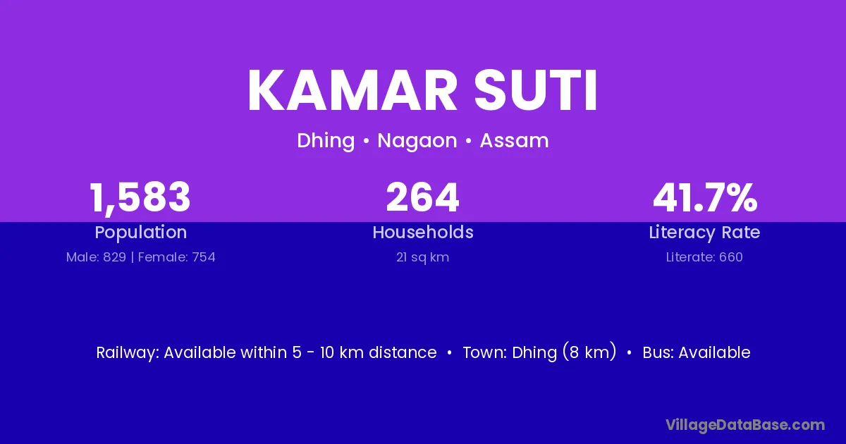 Dhing (8 km) is the nearest town to Kamar Suti village for major economic activities and is located approximately 8 km away.