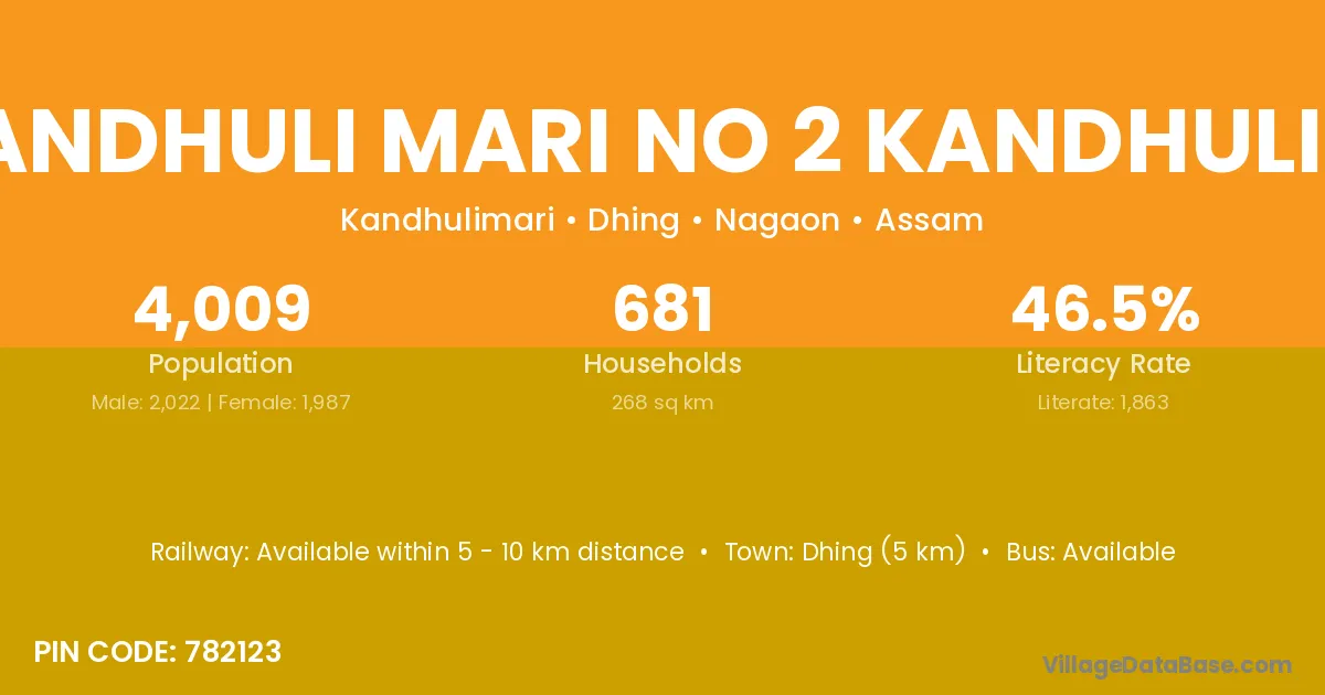 Dhing (5 km) is the nearest town to Kandhuli Mari No 2 Kandhuli M village for major economic activities and is located approximately 5 km away.