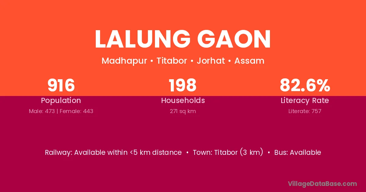 Lalung Gaon village has a total population of 3,274 people, of which 1,663 are males and 1,611 are females.