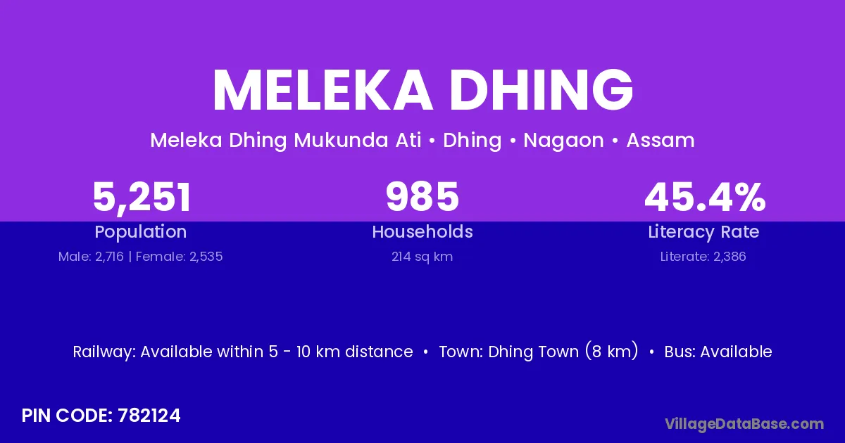 Dhing Town (8 km) is the nearest town to Meleka Dhing village for major economic activities and is located approximately 8 km away.