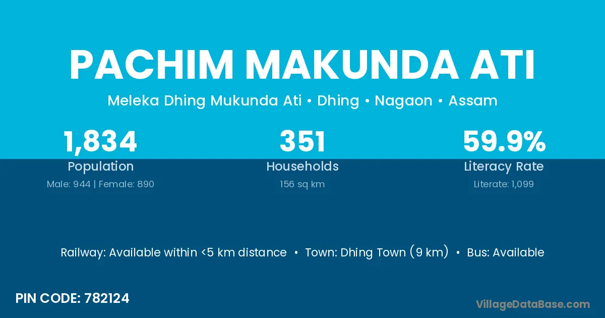 Dhing Town (9 km) is the nearest town to Pachim Makunda Ati village for major economic activities and is located approximately 9 km away.