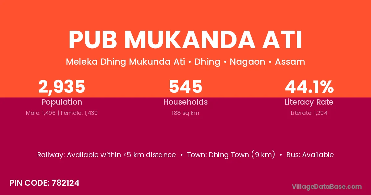 Dhing Town (9 km) is the nearest town to Pub Mukanda Ati village for major economic activities and is located approximately 9 km away.