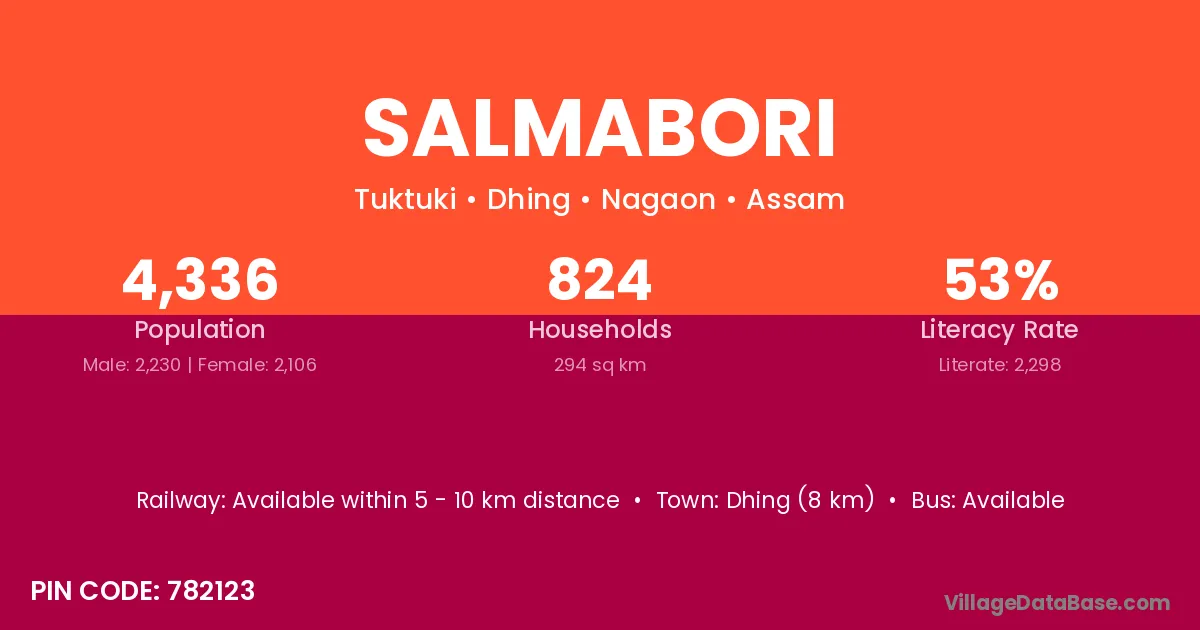 Dhing (8 km) is the nearest town to Salmabori village for major economic activities and is located approximately 8 km away.
