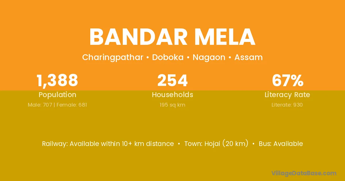 Hojai (20 km) is the nearest town to Bandar Mela village for major economic activities and is located approximately 20 km away.