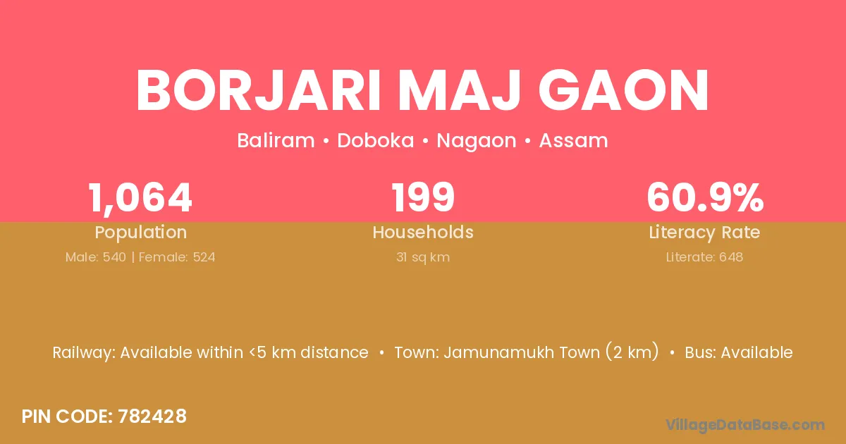 Borjari Maj Gaon village has a total population of 1,064 people, of which 540 are males and 524 are females.
