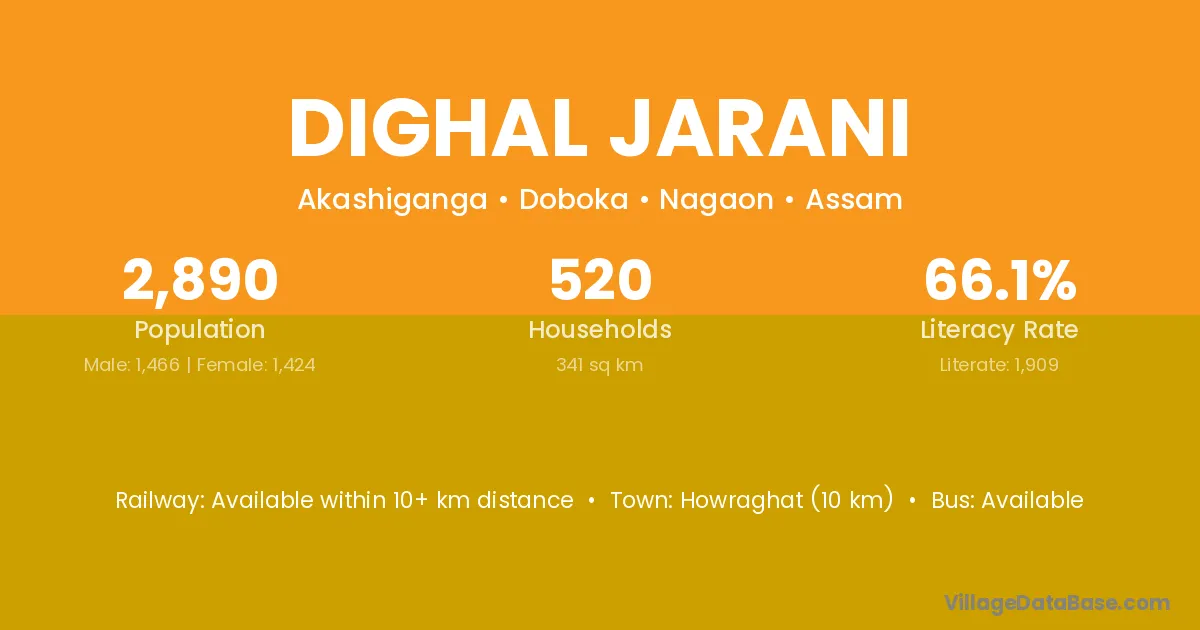 Howraghat (10 km) is the nearest town to Dighal Jarani village for major economic activities and is located approximately 10 km away.