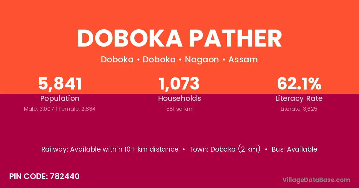 Doboka (2 km) is the nearest town to Doboka Pather village for major economic activities and is located approximately 2 km away.