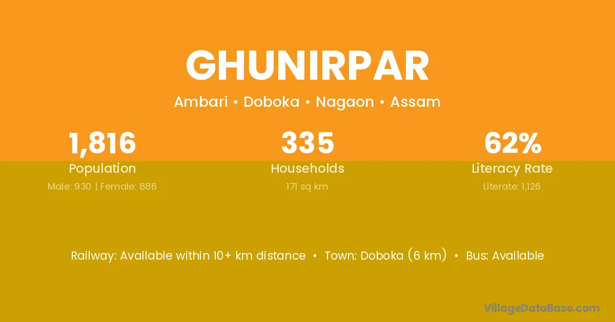 Doboka (6 km) is the nearest town to Ghunirpar village for major economic activities and is located approximately 6 km away.