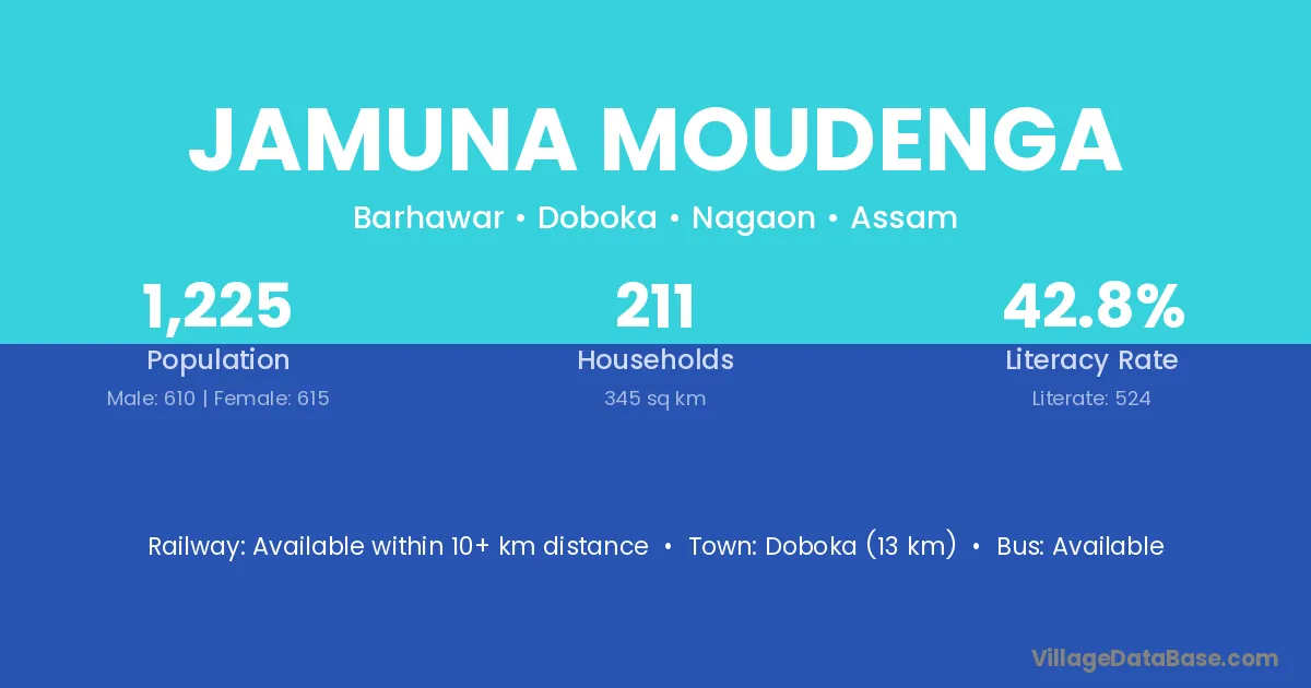 Doboka (13 km) is the nearest town to Jamuna Moudenga village for major economic activities and is located approximately 13 km away.