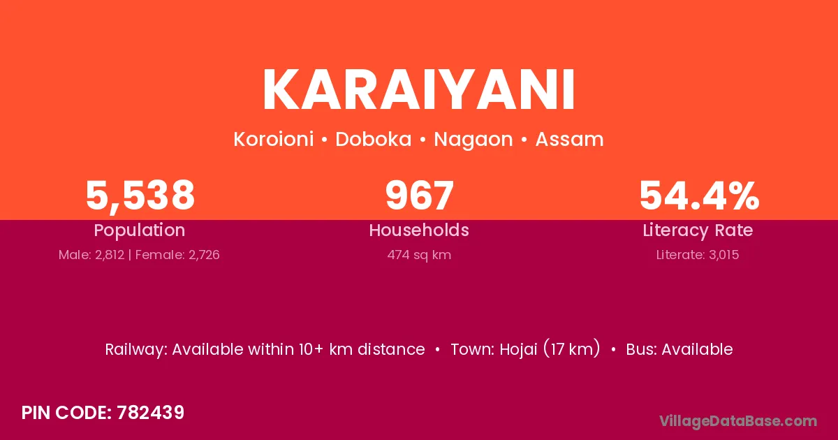 Hojai (17 km) is the nearest town to Karaiyani village for major economic activities and is located approximately 17 km away.