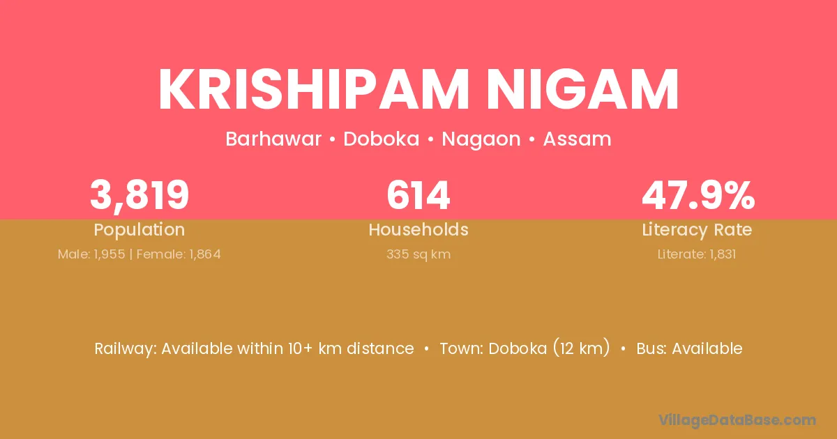 Doboka (12 km) is the nearest town to Krishipam Nigam village for major economic activities and is located approximately 12 km away.