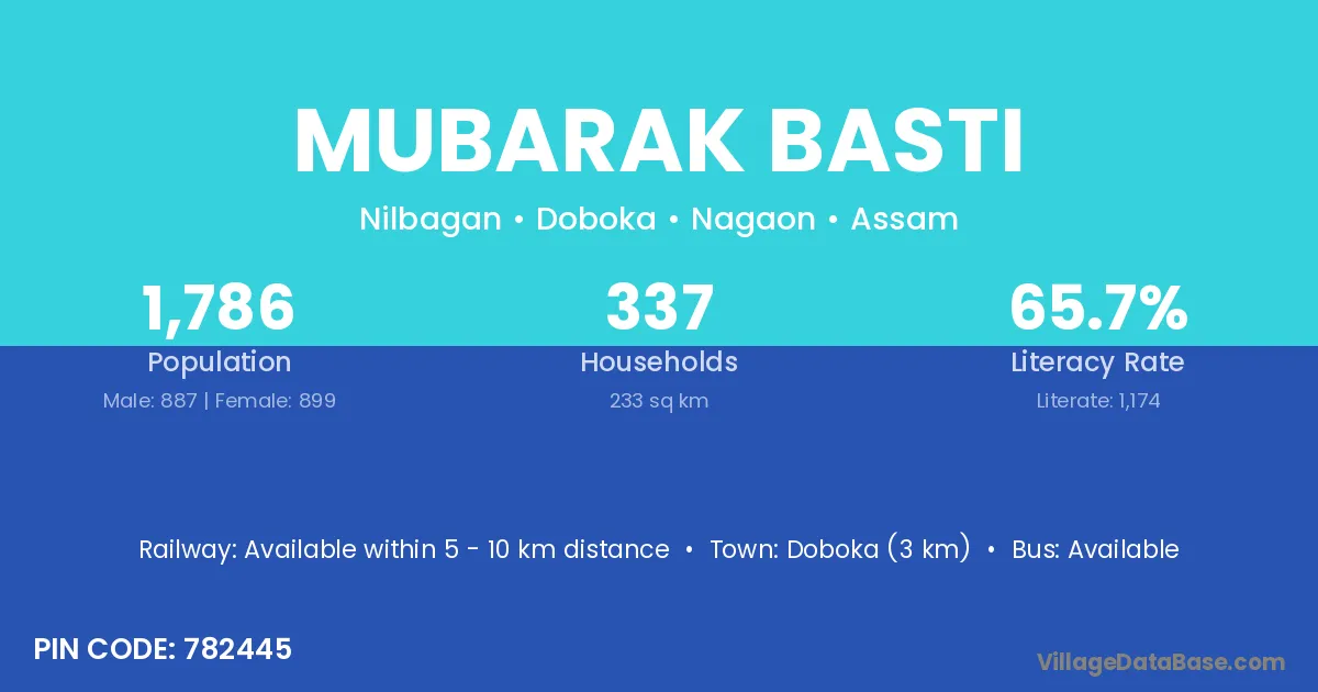 Doboka (3 km) is the nearest town to Mubarak Basti village for major economic activities and is located approximately 3 km away.
