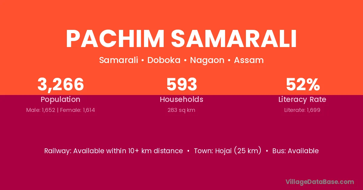 Hojai (25 km) is the nearest town to Pachim Samarali village for major economic activities and is located approximately 25 km away.