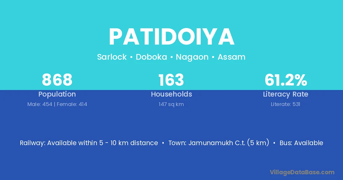Jamunamukh C.t. (5 km) is the nearest town to Patidoiya village for major economic activities and is located approximately 5 km away.