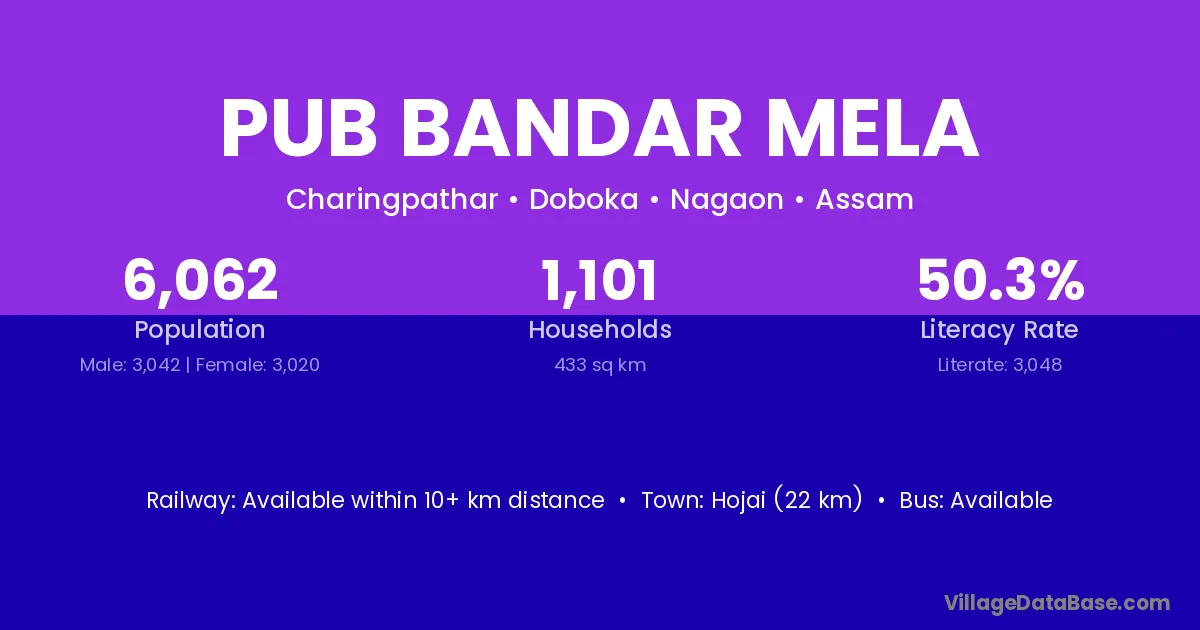 Hojai (22 km) is the nearest town to Pub Bandar Mela village for major economic activities and is located approximately 22 km away.