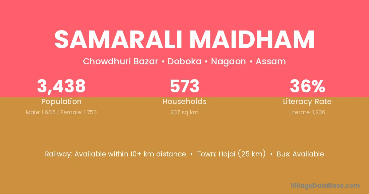 Hojai (25 km) is the nearest town to Samarali Maidham village for major economic activities and is located approximately 25 km away.
