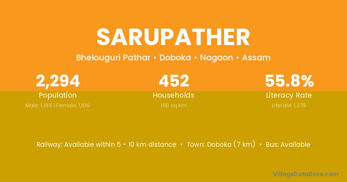 Doboka (7 km) is the nearest town to Sarupather village for major economic activities and is located approximately 7 km away.
