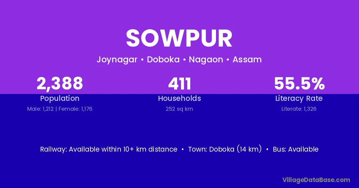 Doboka (14 km) is the nearest town to Sowpur village for major economic activities and is located approximately 14 km away.
