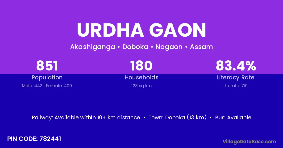 Doboka (13 km) is the nearest town to Urdha Gaon village for major economic activities and is located approximately 13 km away.
