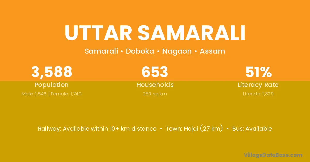Hojai (27 km) is the nearest town to Uttar Samarali village for major economic activities and is located approximately 27 km away.