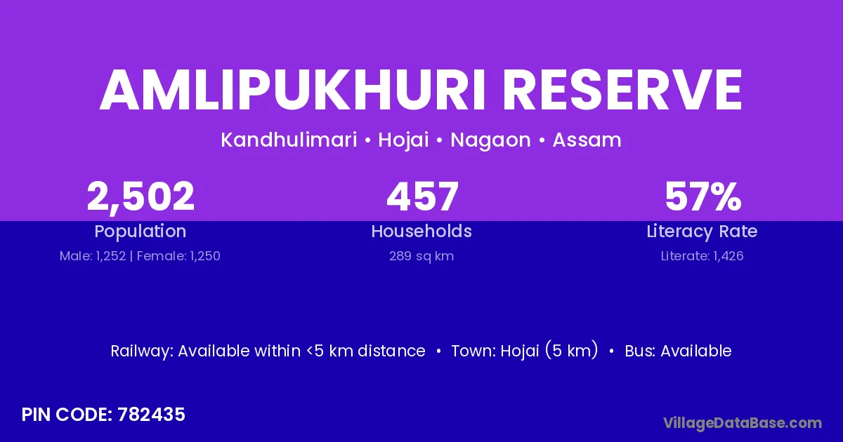 Hojai (5 km) is the nearest town to Amlipukhuri Reserve village for major economic activities and is located approximately 5 km away.