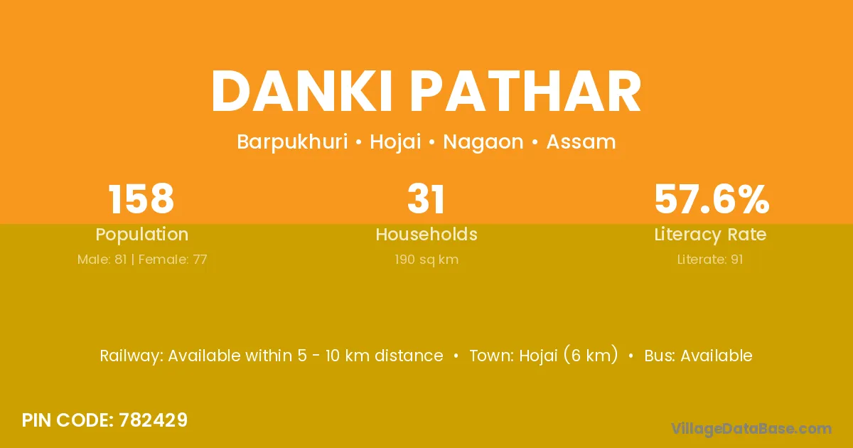 Hojai (6 km) is the nearest town to Danki Pathar village for major economic activities and is located approximately 6 km away.
