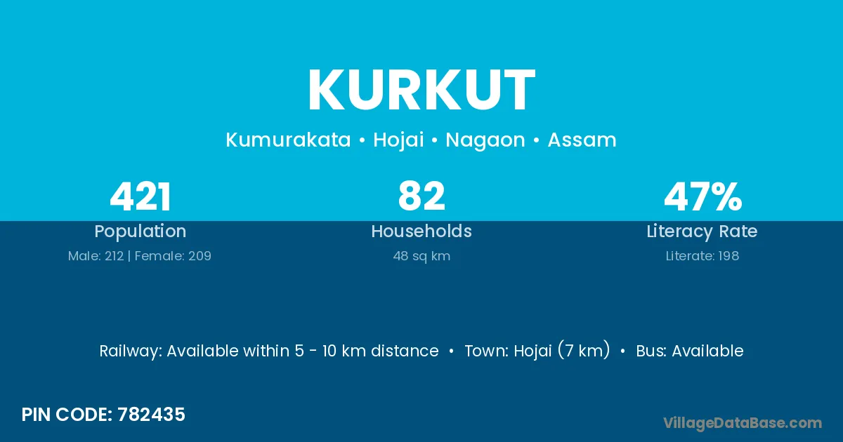 Hojai (7 km) is the nearest town to Kurkut village for major economic activities and is located approximately 7 km away.