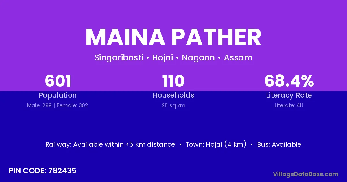 Hojai (4 km) is the nearest town to Maina Pather village for major economic activities and is located approximately 4 km away.