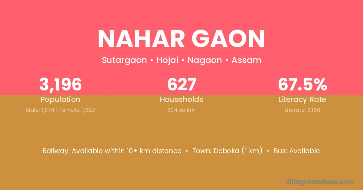 Doboka (1 km) is the nearest town to Nahar Gaon village for major economic activities and is located approximately 1 km away.