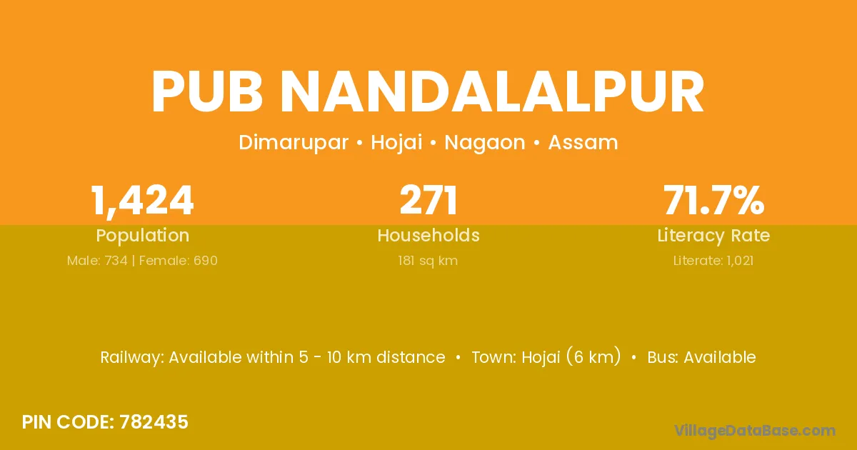 Hojai (6 km) is the nearest town to Pub Nandalalpur village for major economic activities and is located approximately 6 km away.