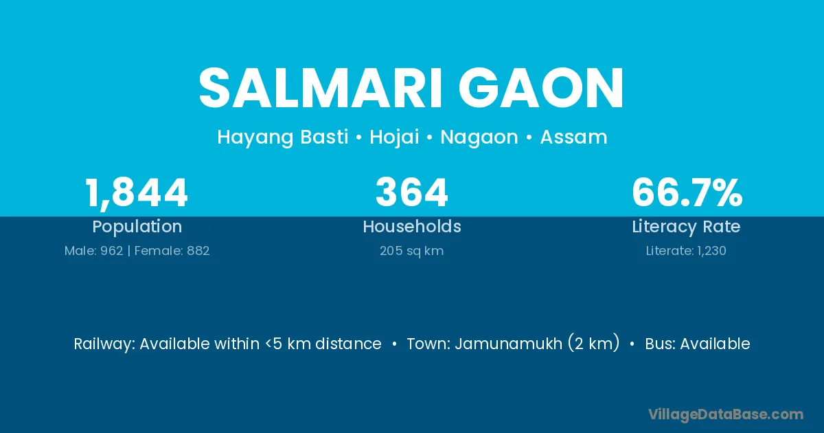 Jamunamukh (2 km) is the nearest town to Salmari Gaon village for major economic activities and is located approximately 2 km away.