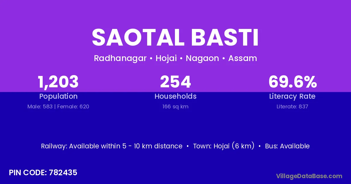Hojai (6 km) is the nearest town to Saotal Basti village for major economic activities and is located approximately 6 km away.