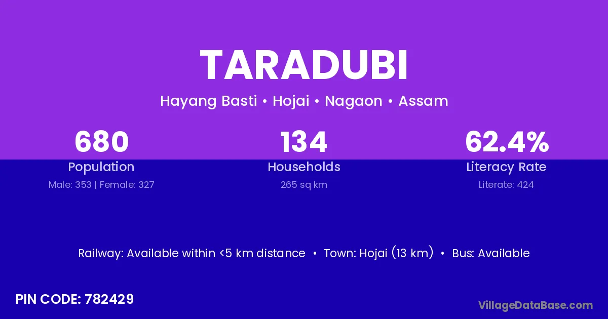 Hojai (13 km) is the nearest town to Taradubi village for major economic activities and is located approximately 13 km away.