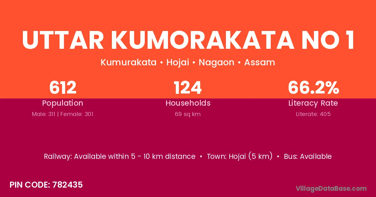 Hojai (5 km) is the nearest town to Uttar Kumorakata No 1 village for major economic activities and is located approximately 5 km away.