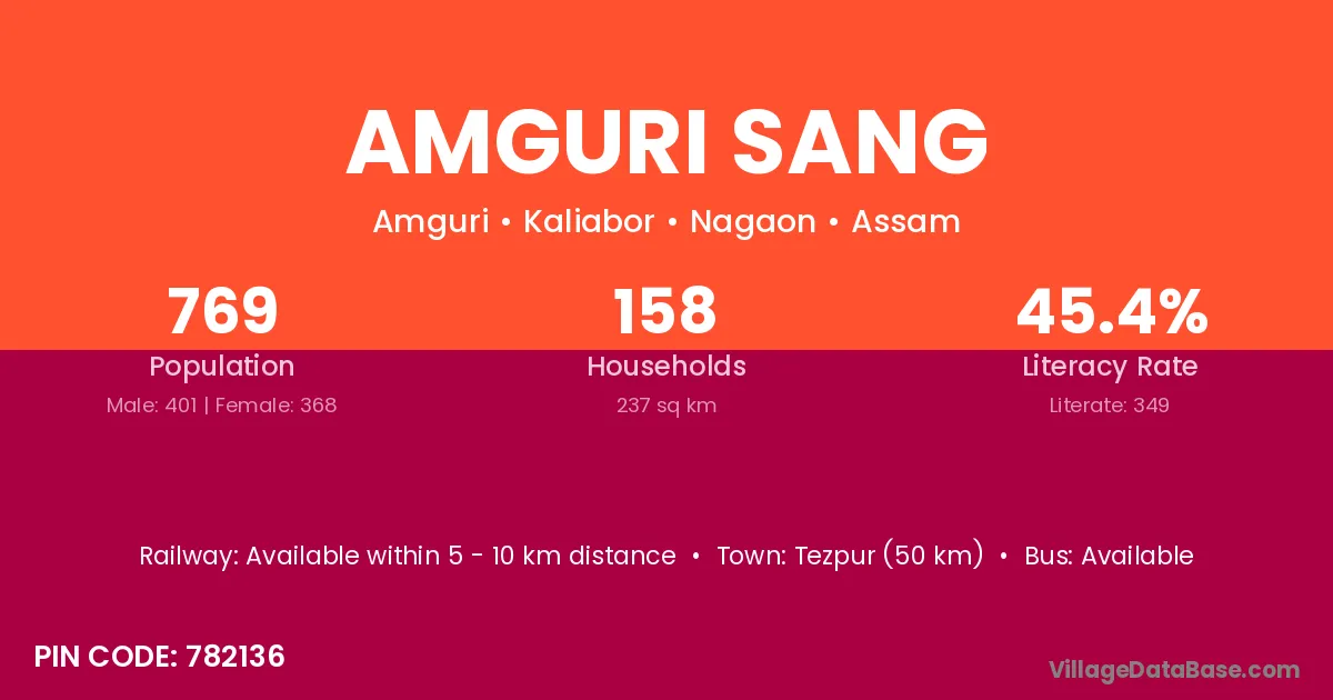 Amguri Sang village has a total population of 769 people, of which 401 are males and 368 are females.