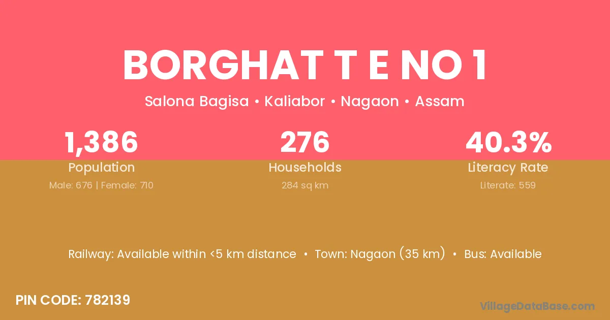 Nagaon (35 km) is the nearest town to Borghat T E No 1 village for major economic activities and is located approximately 35 km away.