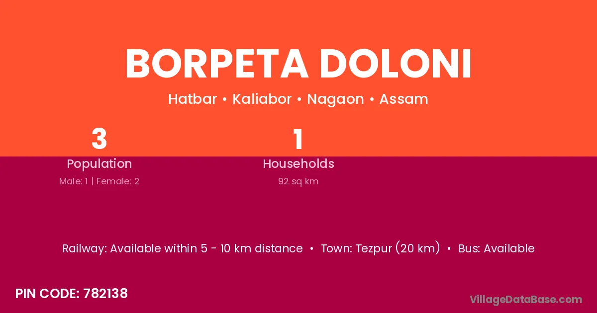 Borpeta Doloni village has a total population of 3 people, of which 1 are males and 2 are females.